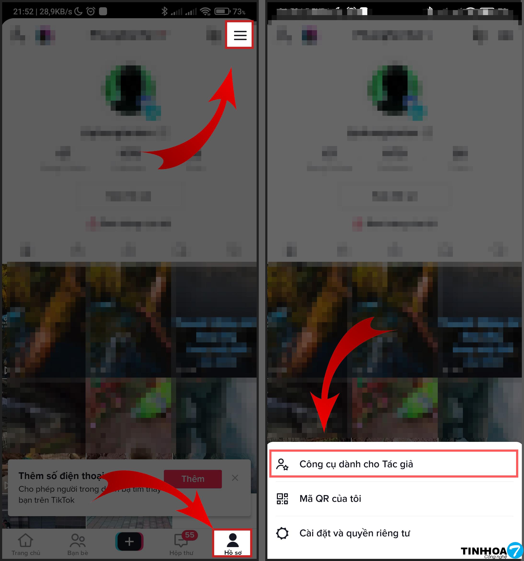 Bước 1 : Mọi người hãy truy cập vào ứng dụng TIKTOK > tiếp theo hãy chọn mục hồ sơ >Chọn 3 gạch > Chọn công cụ dành cho tác giả.