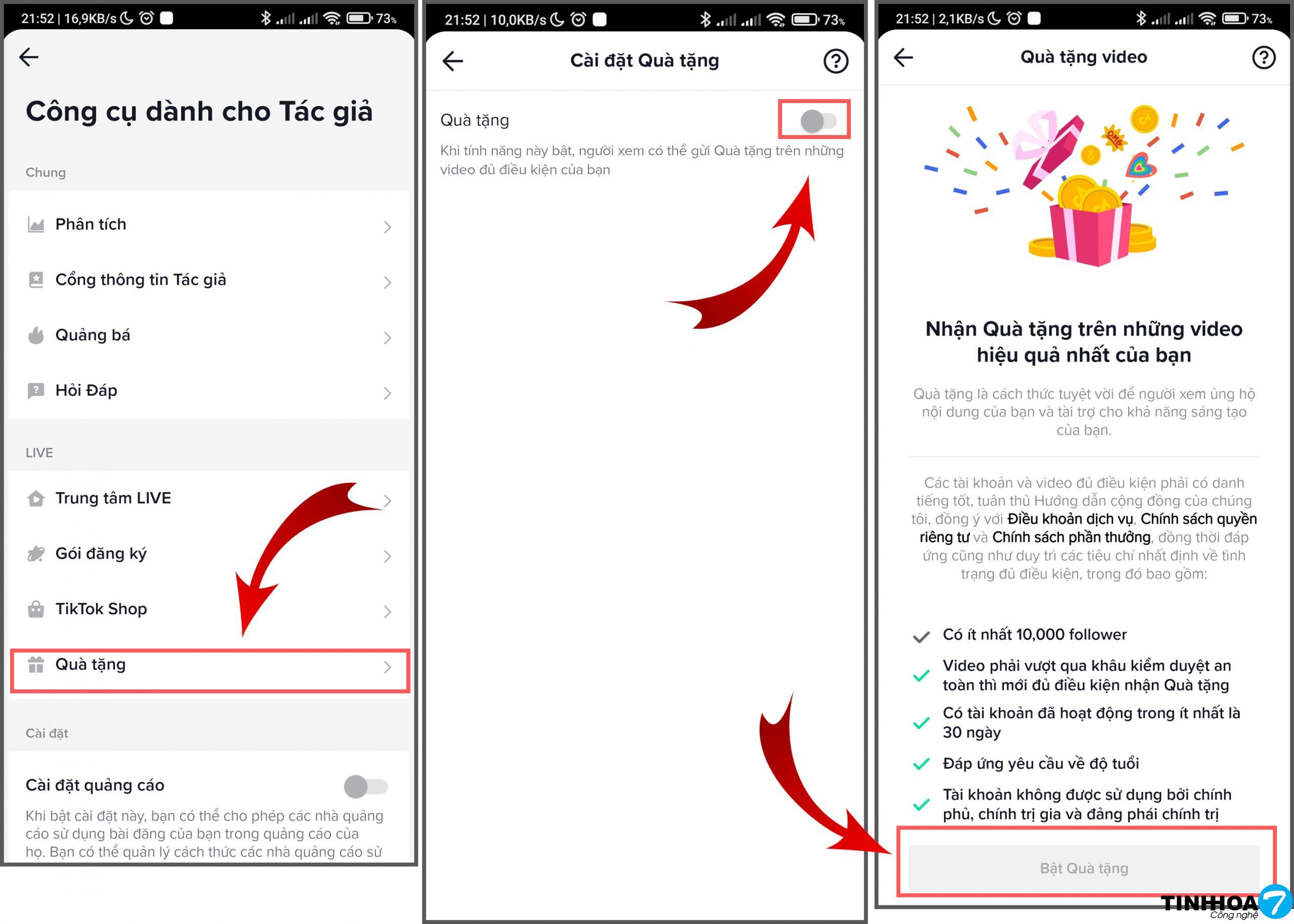 Bước 2 : Tại đây mọi người hãy chọn Quà Tặng > Sau đó mọi người hãy gạt công tác lên > Tiếp theo TikTok sẽ cho bạn thấy điều kiện để có thể sử dụng được tính năng này.Khi bạn đã đủ điều kiện thì chỉ cần chọn chế độ Bật Quà tặng lên là được nha.