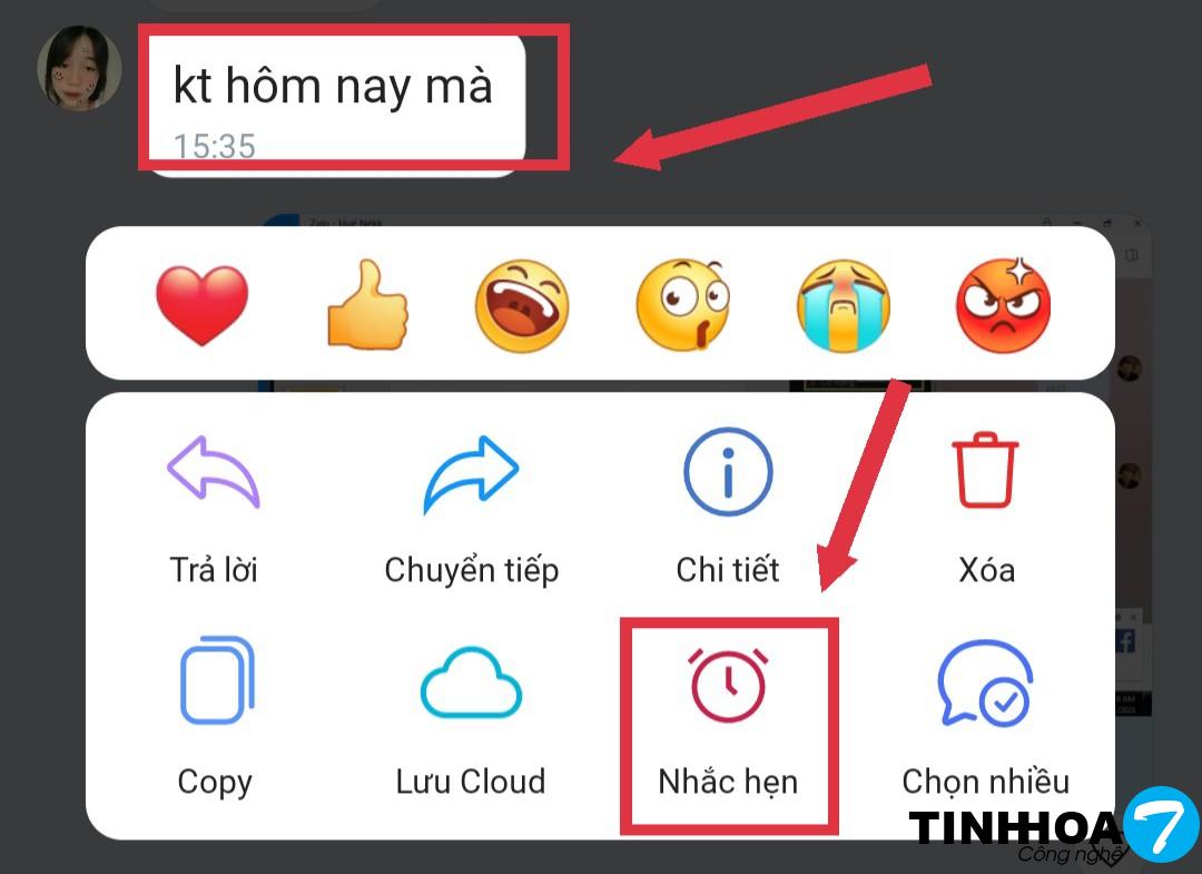 Bước 1 : Trong nhóm hoặc cuộc hội thoại với ai đó, bạn hãy chọn đoạn chat cần nhắc hẹn >> rồi hãy nhấn giữ vào nó >> tiếp theo chọn nhắc hẹn.