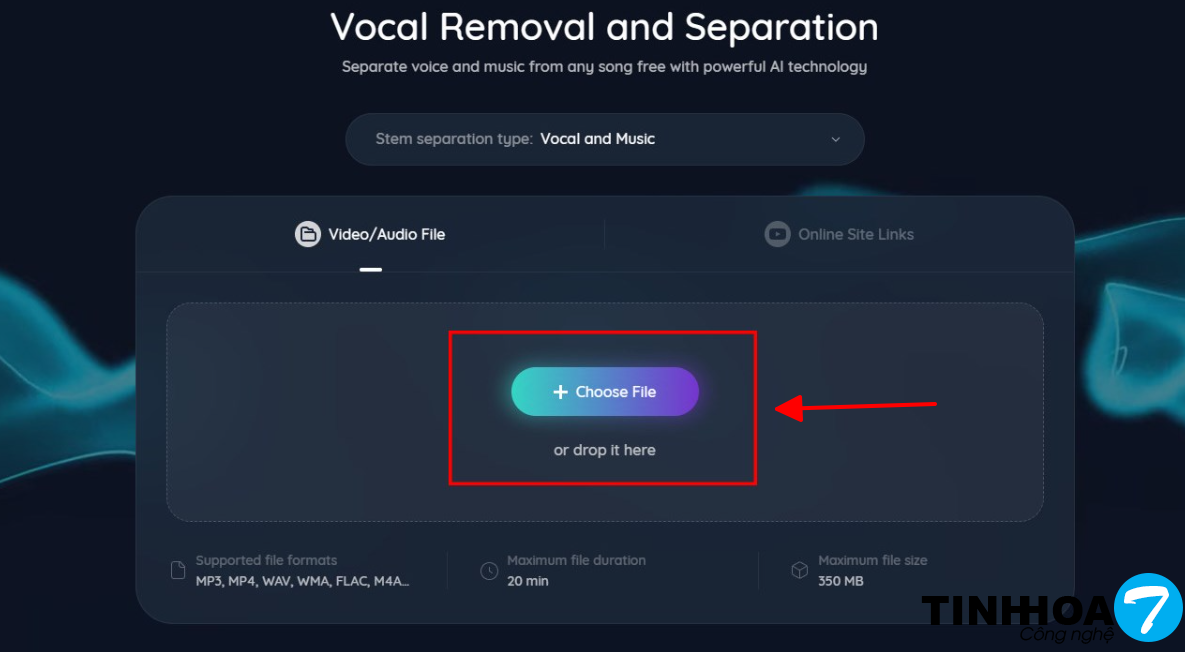 Bước 2 : Nhấp vào Choose File để tải file cần tách lên web với định dạng là MP3, MP4, WAV, WMA, FLAC, M4A… và thời lượng, dung lượng không quá 20 phút và 350MB.