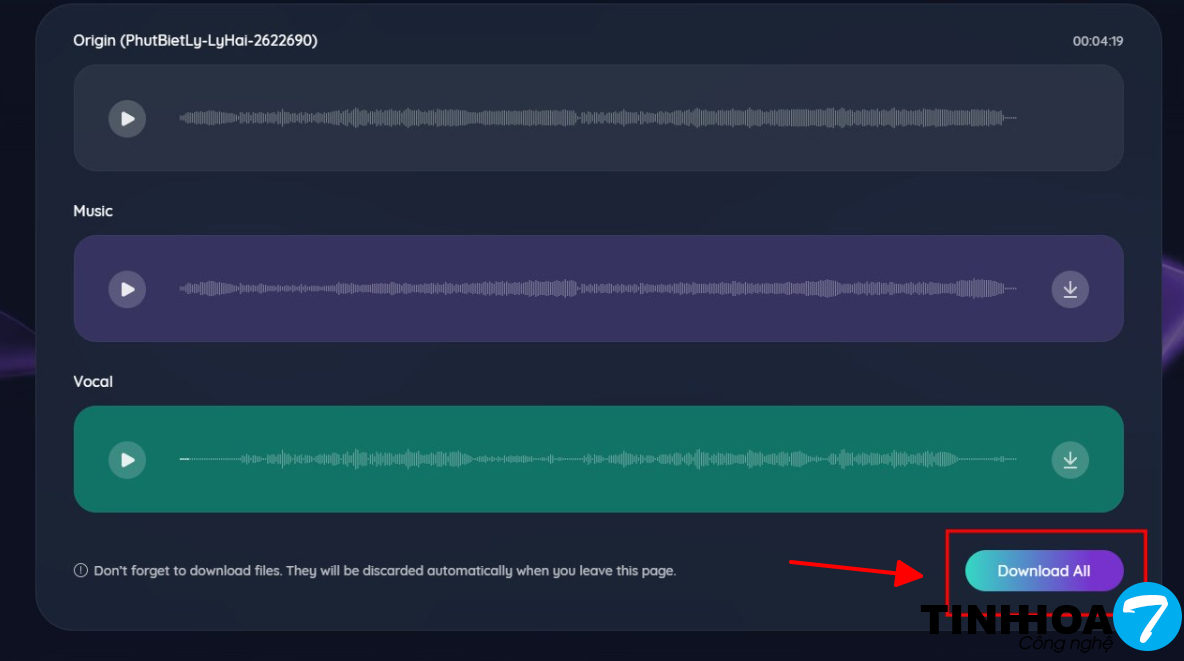 Bước 3 : Đợi mút chút sau đó hệ thống sẽ cho ra kết quả bao gồm Origin, Music, Vocal. Hãy tải về các tệp bạn cần hoặc tải hết thì nhấn Download All.