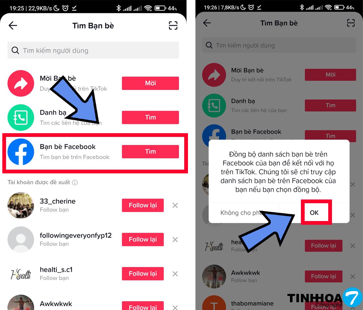 Bước 2 : Chọn mục tìm bạn bè facebook > Chọn OK. Sau đó những người bạn trên facebook sẽ được hiện ra và mọi người chỉ cần nhấn follow để theo dõi họ trên tik tok.